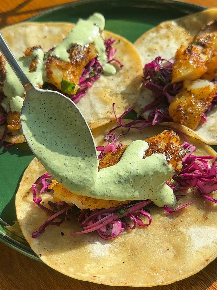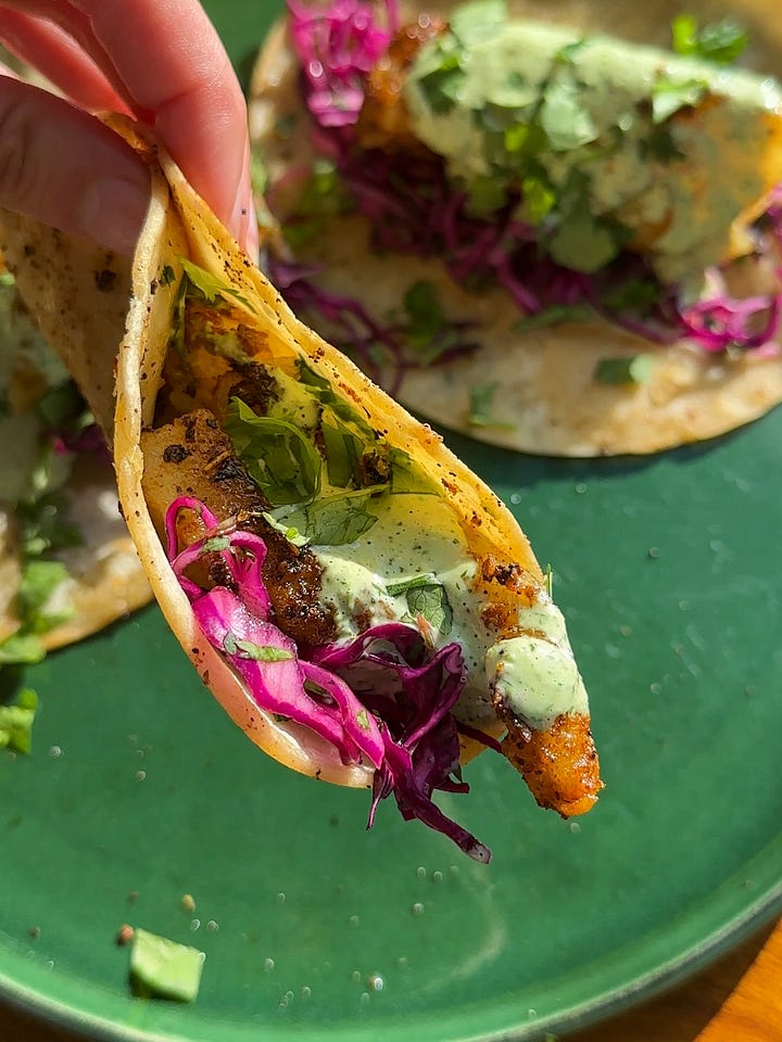 These are so well balanced in flavours and textures: you get tang and crunch from the slaw, deep savouriness and a tender bite from the cod, and creamy, subtle spice from the cilantro lime sauce. Warming the tortillas in the residual cooking fat from the cod makes all the difference too. They turn golden, rich, and soak up the spices left on the pan. Such a delicious combination of flavours. You must make these!