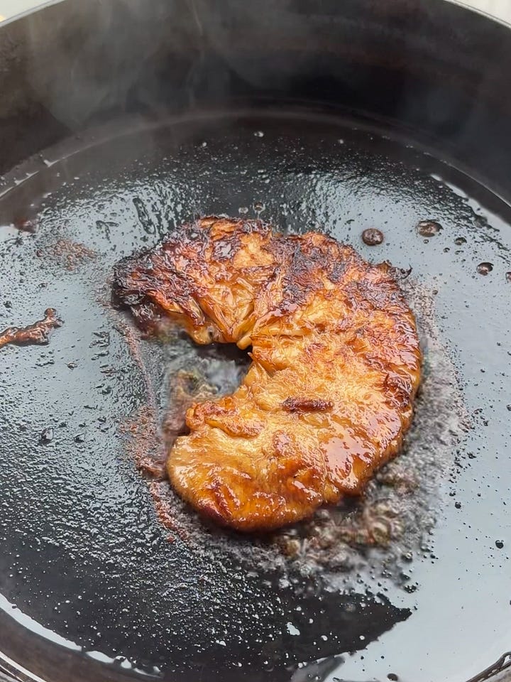 To make the steak, heat olive oil in a large pan over medium heat, preferably a cast iron. Add the lion’s mane and press down firmly with a spatula. Sear until golden brown, about 5 minutes on each side. At the very end of cooking, drizzle with soy sauce and press down to get one last sear, flipping to coat both sides.