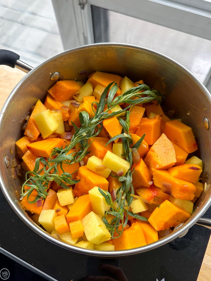 Add squash, potato, salt, tarragon and veggie stock and stir. Bring to a simmer, cover and turn the heat to low. Cook for 25-30 minutes or until the squash is tender and beginning to fall apart.